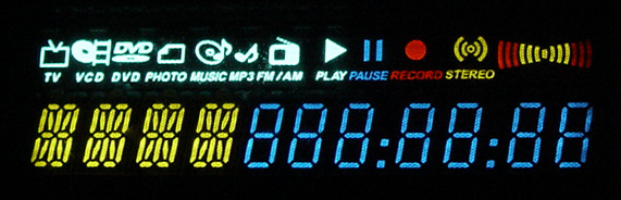 The photo shows a belt of the fields in the font display screen (the dark night is take pictures). There are two features, first is the chinese "ė"can display fonts of numbers and letters, and the second is a screen display with a wide range of colors, such as red, green, blue and yellow and so on. In general, the display content to consider the following: a variety of working conditions such as Play / Record, etc.; volume display; a number of figures such as music; six figures show that when the minutes and seconds; key word if the meter can display letters and other symbols, further enrich the content. Can be seen that seven figures is a more common choice. The photo shows a band of nine field-shaped display screen. There are two features, first is the meter can display fonts of numbers and letters, up to 9; the second is a screen display with a variety of colors; the third is new information for some types of equipment specially designed home appliances.